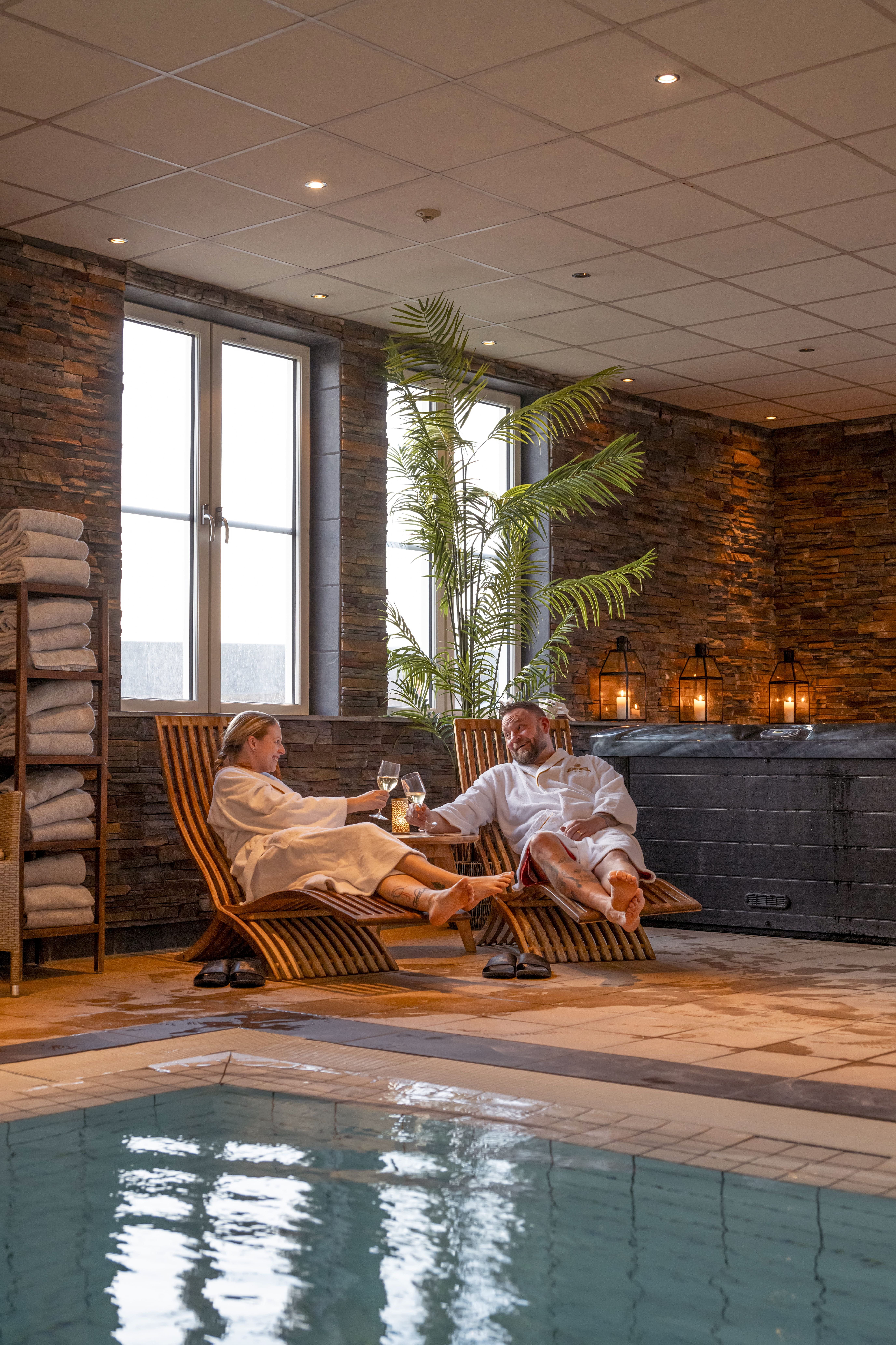 Relaxavdelning har bastu och pool i en trevlig miljö. Det finns möjlighet att köpa lättare mat och dryck att äta i vår lounge. Vid en vistelse får du låna badrock, handduk och tofflor att använda.